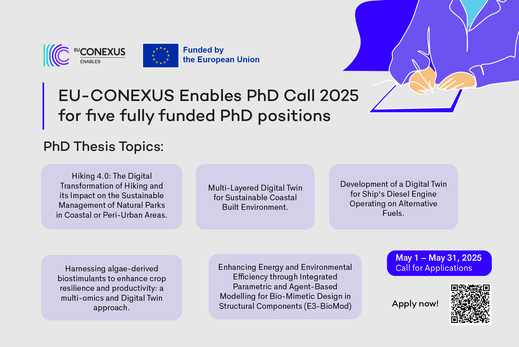 EU-CONEXUS Enables is designed to support early-stage researchers who want to go beyond the lab or library and develop comprehensive solutions for real-world problems. Each selected candidate will work closely with experienced supervisors at two universities, receive a joint PhD degree, and take part in a future-focused research project.
